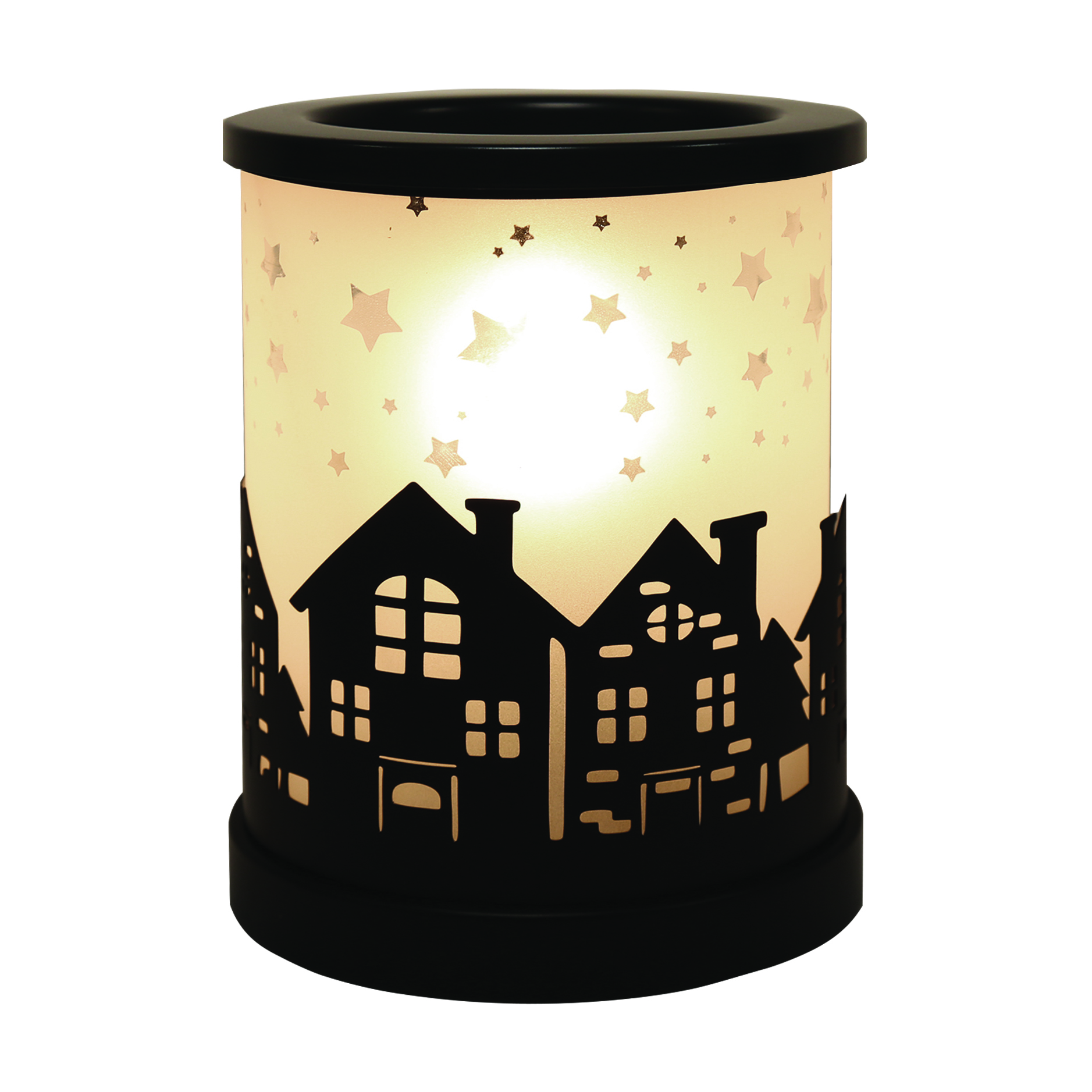 This cylinder shape melter has a beautiful silhouette starry night design in a sleek finish. The intricate black cut out design showcases a shadow effect stars behind houses allowing light to shine through, giving off a homely feel whilst filling the room with your favourite wax melt fragrance.